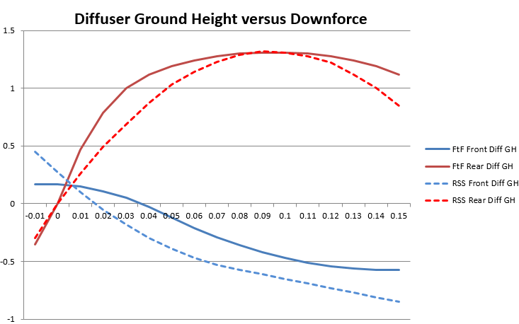 - Aero-stability increased – the fluctuations in downforce as the car loads up and the back-end gets pushed down lower have been smoothed-out significantly. See graph.